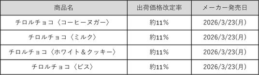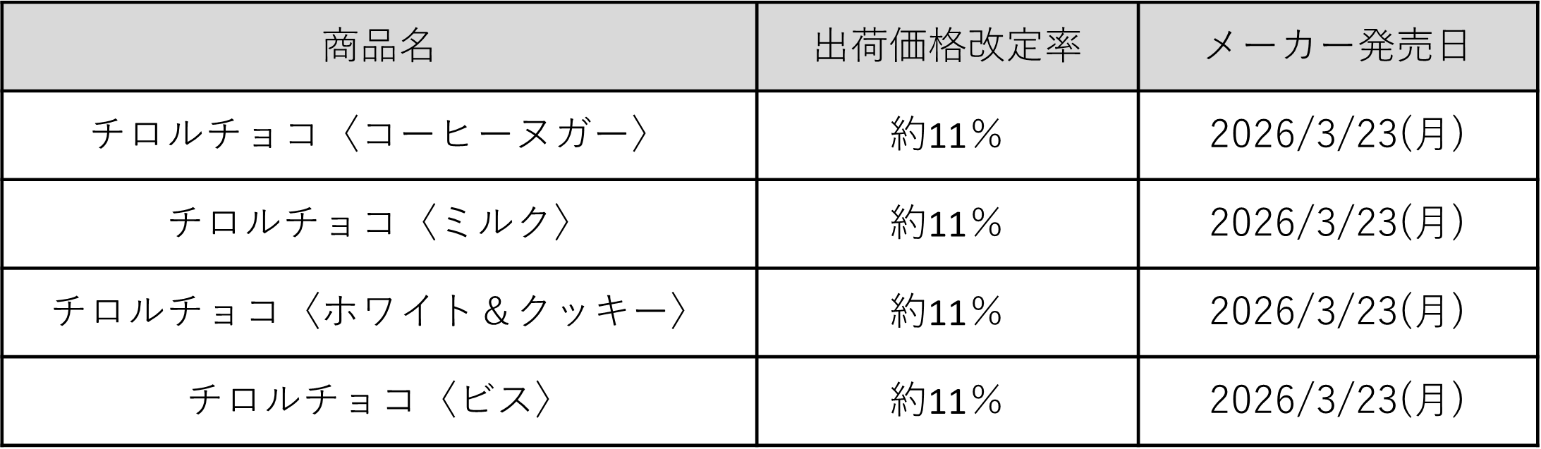チロルチョコ株式会社(所在地:東京都千代田区 代表取締役社長:松尾裕二)は、一部商品の価格改定を実施いたしますのでお知らせします。