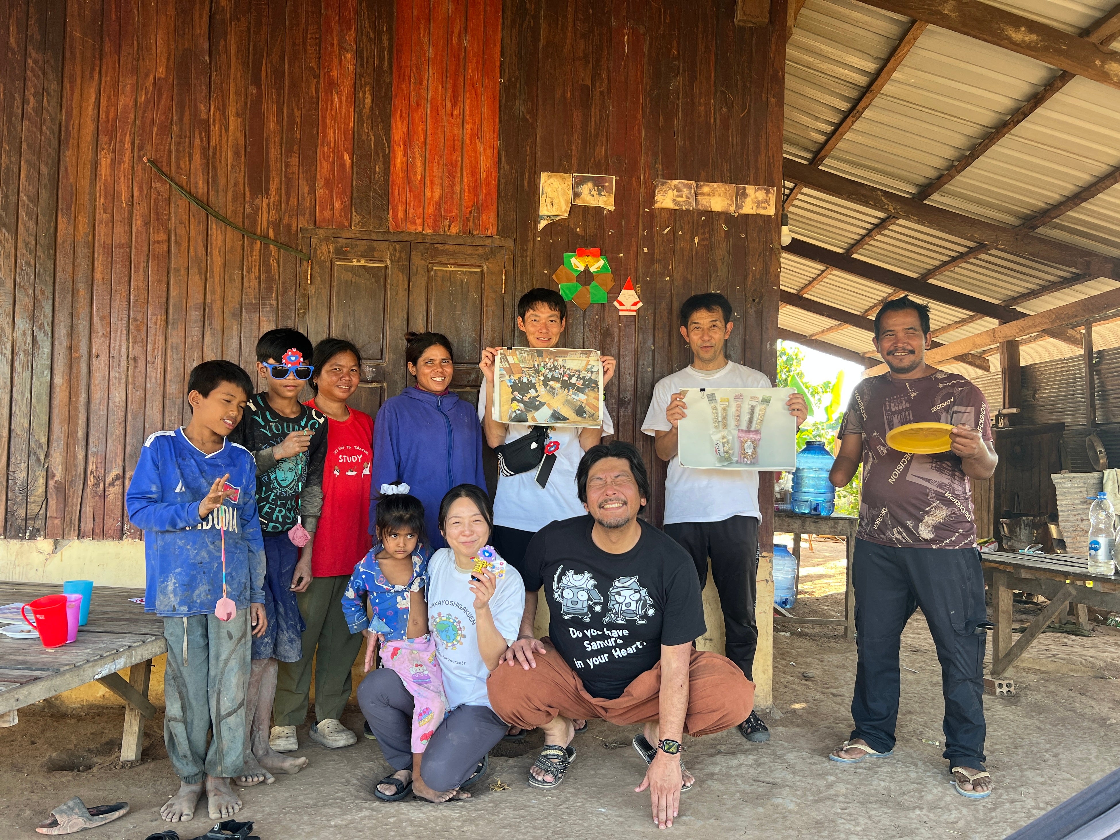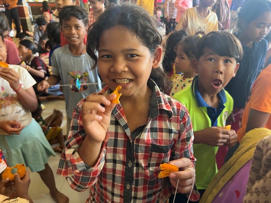 フリースクール作成のドライフルーツに喜ぶカンボジア難民の子どもたち
