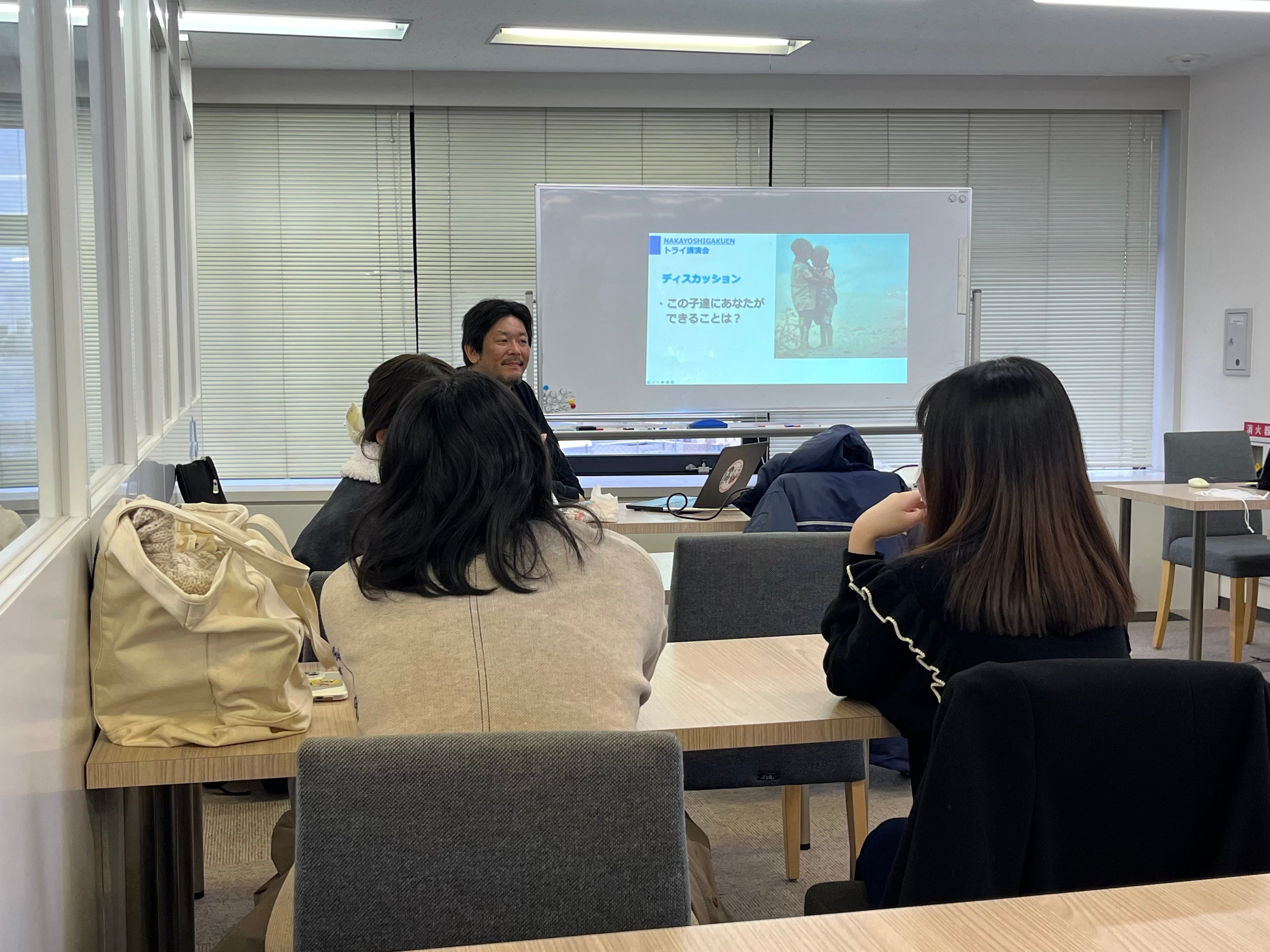 講師を務めた中村雄一は、家庭教師のトライのプロ講師として教育現場に関わる一方、NPO法人なかよし学園プロジェクト代表として、アフリカや中東など世界各地で教育支援や平和教育活動を行っています。講演では、紛争地域や貧困地域の教育現場での授業の様子や、日本の学校と世界の子どもたちが学びでつながる取り組みが紹介されました。