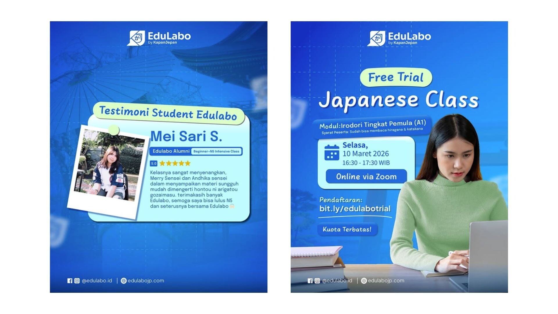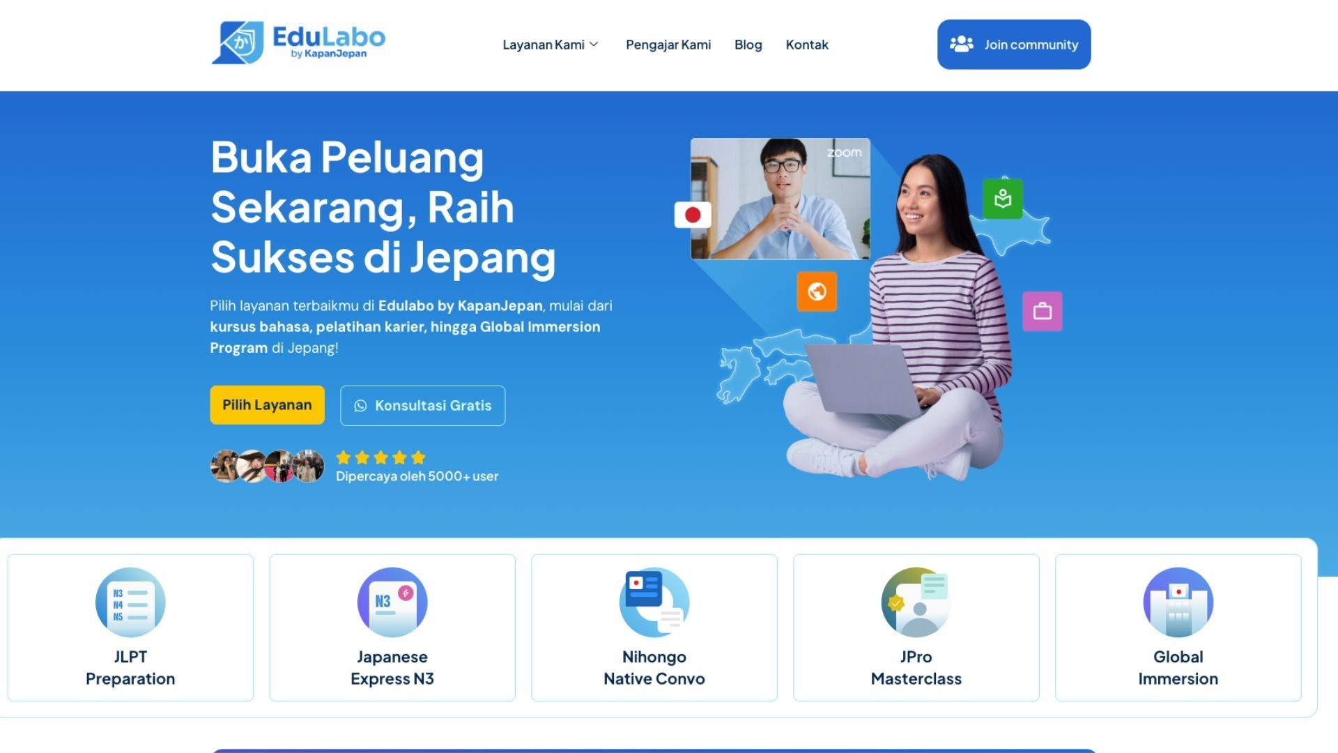 EduLaboは、日本での進学や就職を目指すインドネシア人を対象に、日本語教育およびキャリア支援を提供する有料の教育サービスです。初級レベルから日本語能力試験(JLPT)N3レベルまでを対象としたカリキュラムを提供し、日本語学習を通じて日本でのキャリア形成を目指す学生や社会人の支援を行っています。