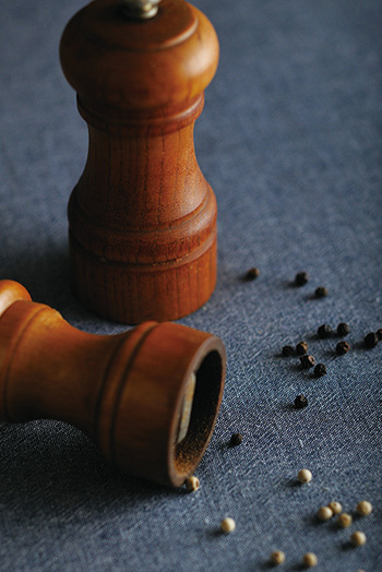 仕上げにかける挽き立てのこしょうの香りは格別。こしょうの粗さを調整できるタイプなら、より好みの味わいに近づける。白こしょう用と黒こしょう用のふたつを用意したい。