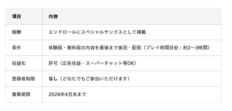 2026年第2四半期リリース予定の本作の体験版・無料版を配信・実況いただいた方を、ゲーム本編のエンドロールにスペシャルサンクスとして掲載いたします。