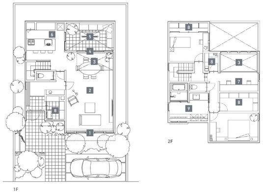 本プランの最大の特徴は、北側に大きく開いた窓と、外構パネルで囲まれた「ノースガーデン(北庭)」です。北向きの大開口は直射日光を避け、暑さ・眩しさを防ぐことができるため、カーテンを開けたまま一日を快適に過ごすことができます。南向きの開口でカーテンを併用する場合と同等の健康的な明るさ※1を、北向きの大開口でも十分に得られるというシミュレーション結果も出ています。※2また、外構パネルが周囲からの視線を遮るため、カーテンを閉めずに開放的に過ごせるプライベートな外部空間を実現。夏でも日陰で涼しく、子どもの遊び場としても最適です。相対する南側の窓はあえて低く抑え、2階のボリュームを張り出して強い日射を遮ります。さらに、南の下方から風を取り込んで北の高い窓へと風を抜く、微気候設計を採用しました。また、室内から室外への視線をコントロールして電線や街灯などのノイズをカットすることで、住まいに視覚的な静寂をもたらします。