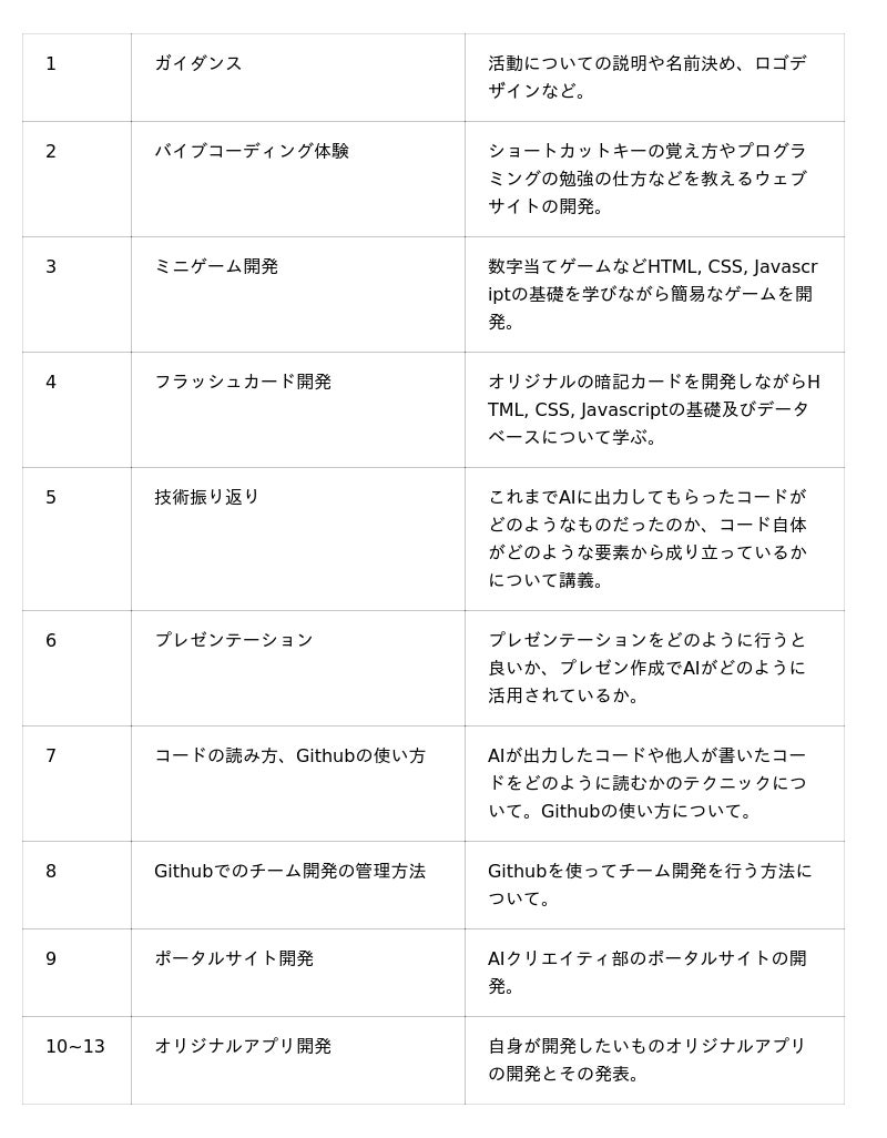 2024年7月27, 28日及び11月16, 17日に行った「AIで簡単!ウェブサイト作成ワークショップ」及び、2025年7月28日に行った「(旧名)ミライエデジタルクラブ体験会」のワークショップ形式から定期活動へと移行したものとなります。