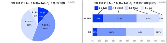 日常生活で「もっと配慮があれば使いやすくなるのに」と感じた経験有無について、「よくある」「たまにある」と回答した割合は55.6%に達しています。特に、回答者自身や家族が障がい・高齢・介護等に関わる「コア当事者」では62.7%と一般層と比較して15%以上不便を感じる割合が高く、既存製品が多様なユーザーに最適化しきれていない現状が浮き彫りとなりました。これらリードユーザーの「切実な不便」を起点に新たな価値を共創することは、単なる個別対応ではなく、すべての人にとっての「真の使いやすさ」や「普遍的な価値」を生み出すための原動力となり得ると考えられます。