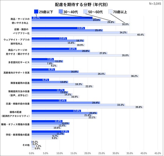 (4)「配慮」への期待:30~40代は、商品・サービスの使いやすさ等の生活実務に直結する改善を求め、70代以上は、外出や移動における物理的ハードルの改善を求める傾向。