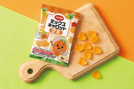 にんじんと7種類の果汁をミックスしたCO・OP ミックスキャロットを2.8%配合したハート型がかわいいグミです。食べやすいようフルーティな味わいにし、柔らかい食感で味わいを感じやすくしました。分包タイプなので少しずつ食べられて持ち運びにも便利です。