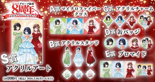 結成8周年を祝うイベントに参加するドレス姿のえのぐをイメージした描き下ろしイラストを制作。ここでしか手に入らない限定デザインで、記念グッズをラインナップしました。