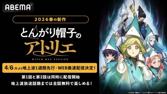 新しい未来のテレビ「ABEMA」は、2026年新作春アニメ『とんがり帽子のアトリエ』を、2026年4月6日(月)から毎週月曜日夜11時より、地上波1週間先行・WEB最速配信いたします。