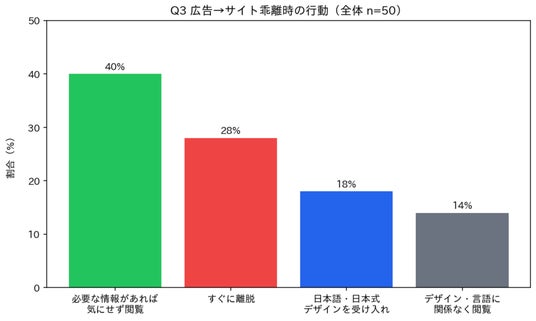 設問文:「SNS広告をクリックして遷移したWebサイトのデザインや言語が広告と大きく異なっていた場合、あなたはどうしますか?」