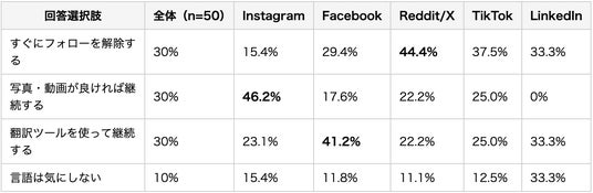 プラットフォームごとの英語非対応への許容度には最大3倍の差があります。Reddit/Xユーザーは44%が即離脱と最も拒絶感が強く、一方でInstagramユーザーは15.4%と最も寛容で、46.2%が「写真が良ければ継続」と回答しています。