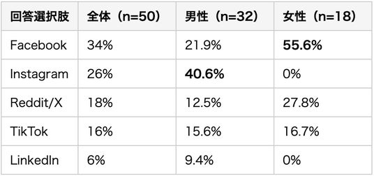 最も驚くべき発見は男女の利用SNSの完全な分岐です。男性はInstagram最多(40.6%)に対し、女性のInstagram利用者はゼロ。女性はFacebook一択(55.6%)という構造になっています。これは「ビジュアル訴求ならInstagram」という一般論が、女性ターゲットには全く当てはまらないことを示しています。