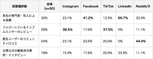 プラットフォームごとに信頼源が明確に分化しています。Instagramではインフルエンサー(38.5%)、FacebookとLinkedInでは実名専門家(41.2%・66.7%)、Reddit/Xでは匿名口コミ(44.4%)が最も信頼されます。マルチプラットフォーム展開では、プラットフォームごとに異なる信頼源を活用した独立した戦術設計が必要です。