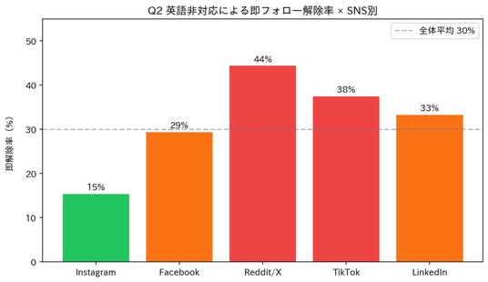 英語対応への投資優先度は、プラットフォームによって大きく異なります。Reddit/Xでは英語非対応の即離脱率が44%と最高で、運用開始前に英語ライティング体制を確立することが前提条件です。一方Instagramでは15.4%と最も寛容で、高品質なビジュアルさえあれば言語の壁を相当程度カバーできます。「全チャネル均等に英語対応」よりも、プラットフォームの文化に合わせた投資配分が現実的です。
