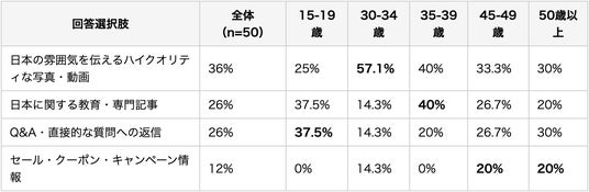 「日本の雰囲気を伝えるハイクオリティな写真・動画」が36%でトップ。欧米ユーザーは日本企業のSNSにプロモーションではなく、体験・知識・対話を求めています。セール・クーポン情報はわずか12%と最下位で、例外として有効なのは45歳以上をターゲットにした場合のみです。