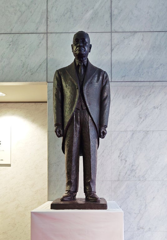 創業者 早川徳次の銅像です。シャープの前身に当たる早川電機工業の創業55周年を記念し、1968年に地域販売店組織「全国シャープフレンドショップ会」有志より贈呈されました。西田辺、堺、堺筋本町へと、本社移転のたびに大切に運ばれてきました。