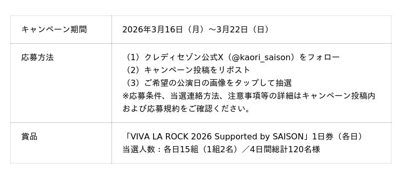 株式会社クレディセゾン(本社:東京都豊島区、代表取締役(兼)社長執行役員COO:水野 克己、以下:当社)は、2026年5月3日(日・祝)~5月6日(水・休)に埼玉県の埼玉スタジアム2002周辺・野外特設会場で開催される大型ロックフェスティバル「VIVA LA ROCK 2026 Supported by SAISON」に特別協賛いたします。