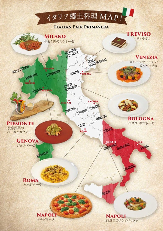 焼きたて窯焼きピザ、パスタ、アクアパッツァ、カルパッチョ、カプレーゼにラザニアまで前菜からドルチェまで揃う、春のイタリアンフェア!イタリアの“おいしい”をテーブルいっぱいにどうぞ。
