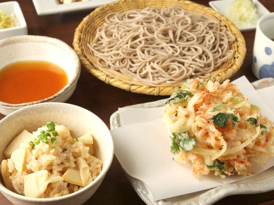 - ランチタイムには本格蕎麦と「海老天丼」や「ロースかつ丼」など、こだわりの丼ぶりを一緒に味わえるボリューム満点のセットをご用意しております。さらに春の味覚であるたけのこや桜海老を取り入れた、この季節だけの限定セットもお楽しみいただけます。