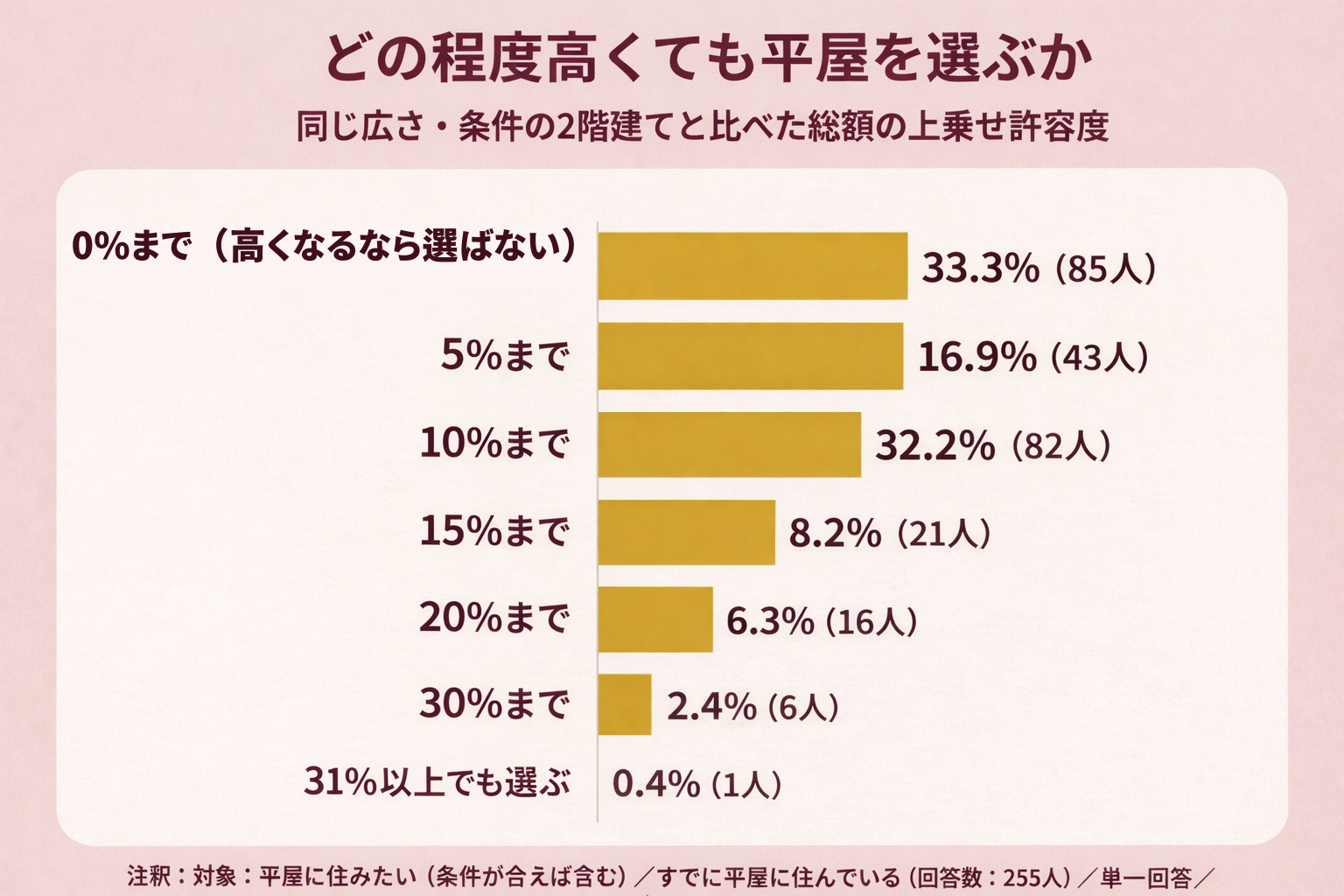 「0%まで」と「10%まで」が拮抗して最多を占める結果は、平屋への関心の高さと、現実的な予算制約との板挟みを象徴しています。