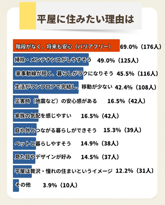 - 平屋に住みたい理由の上位は、階段のない暮らしへの安心感や将来を見据えた実用性