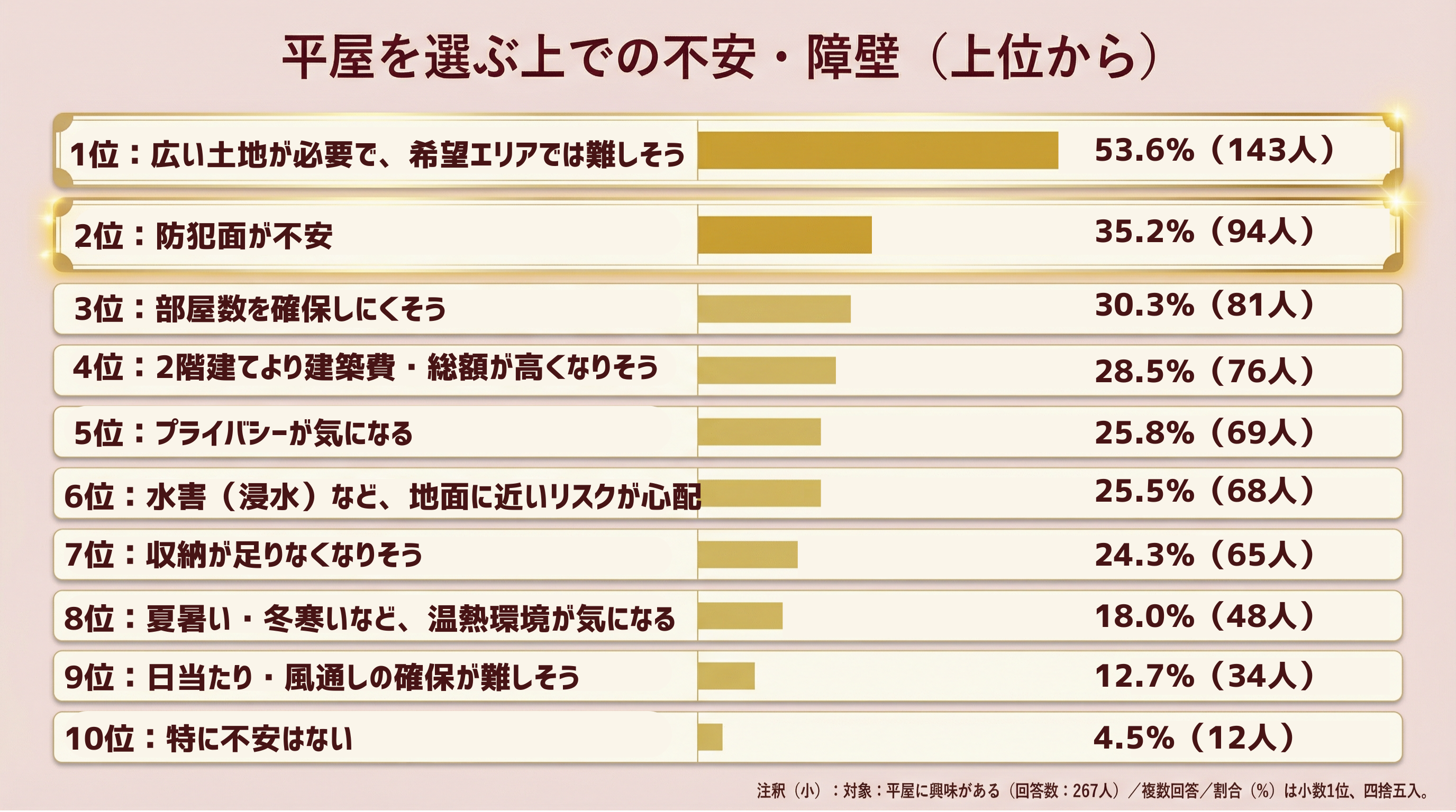 一方で、平屋の障壁として広い土地、建築費、防犯が上位となり、理想と現実のギャップも同時に見えてきました。