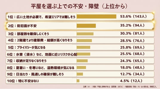 平屋に興味がある人(267人)に、平屋を選ぶ上での不安・障壁を聞いたところ、上位は次の通りとなりました(複数回答)。