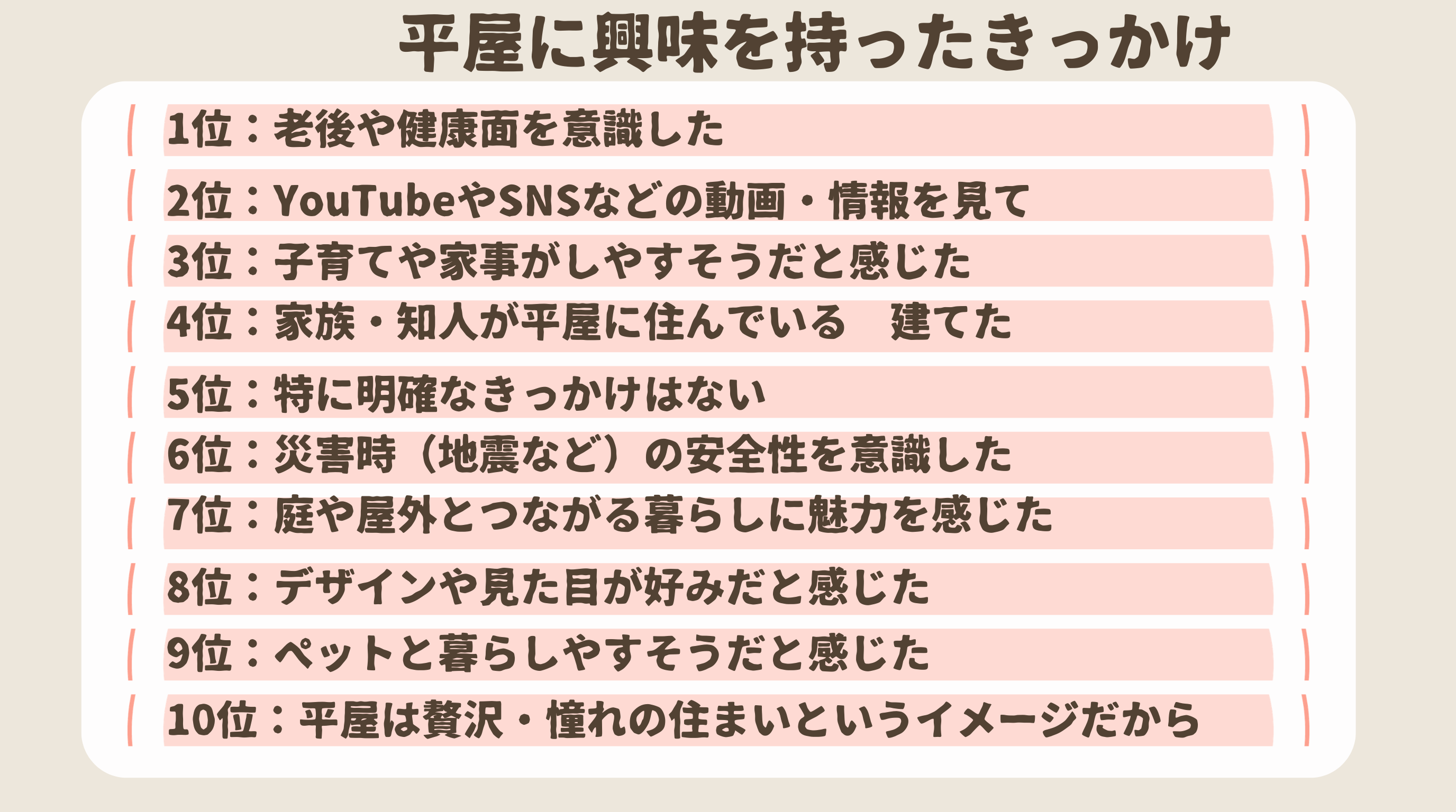 【結果2】平屋に興味を持ったきっかけTOP10――老後・健康意識と情報接触が中心