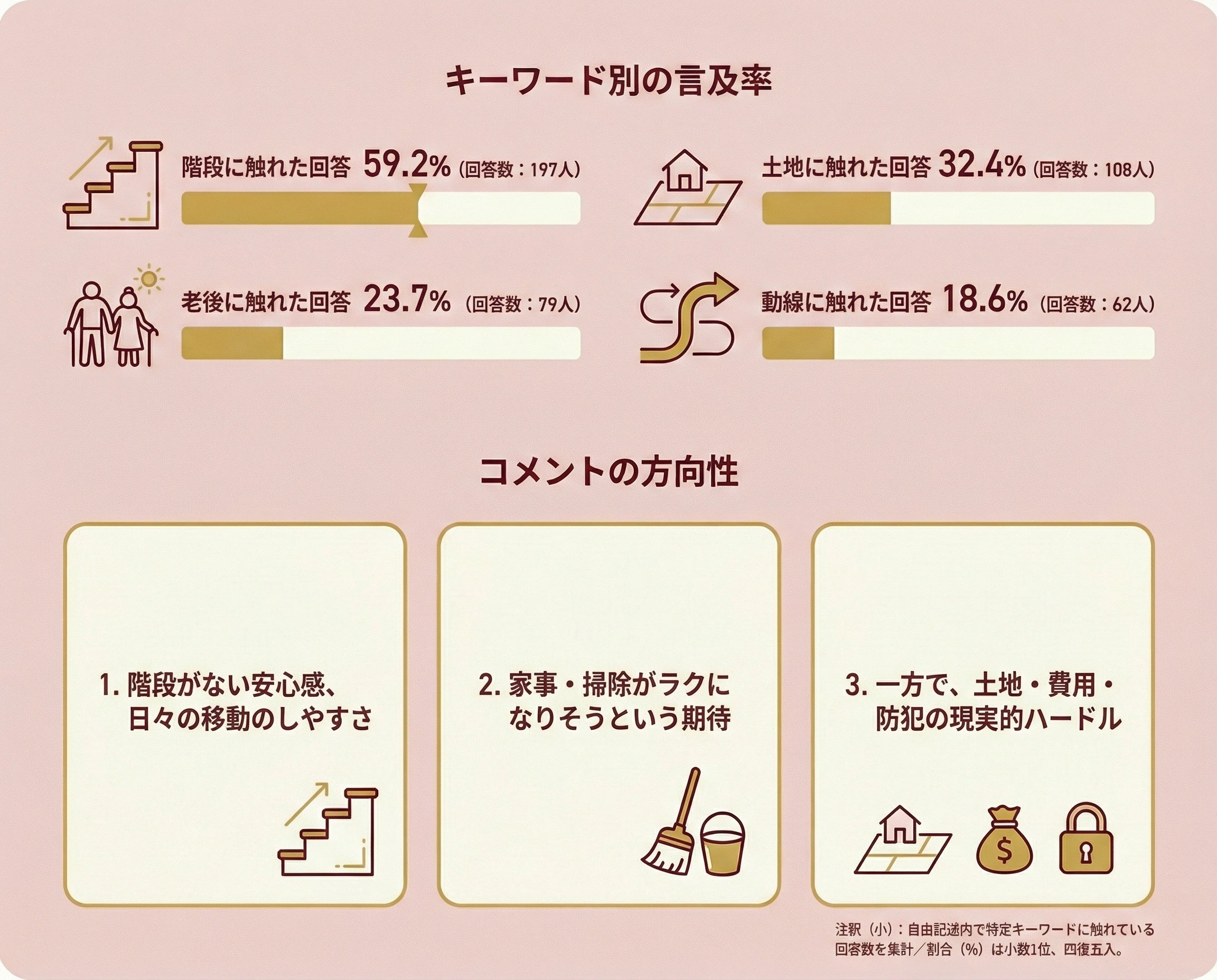 階段への言及が約6割を占める結果は、平屋のイメージが「階段のない暮らし」そのものと強く結びついていることを示しています。