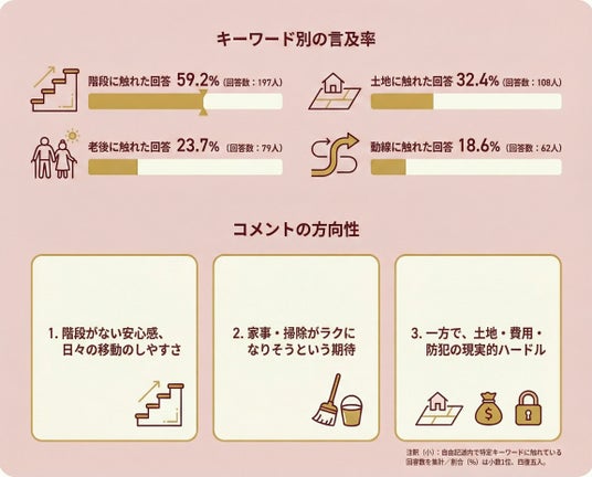 老後や動線に関するコメントも多く、これらはいずれも階段がないことから派生する安心感や利便性として語られているケースが目立ちました。