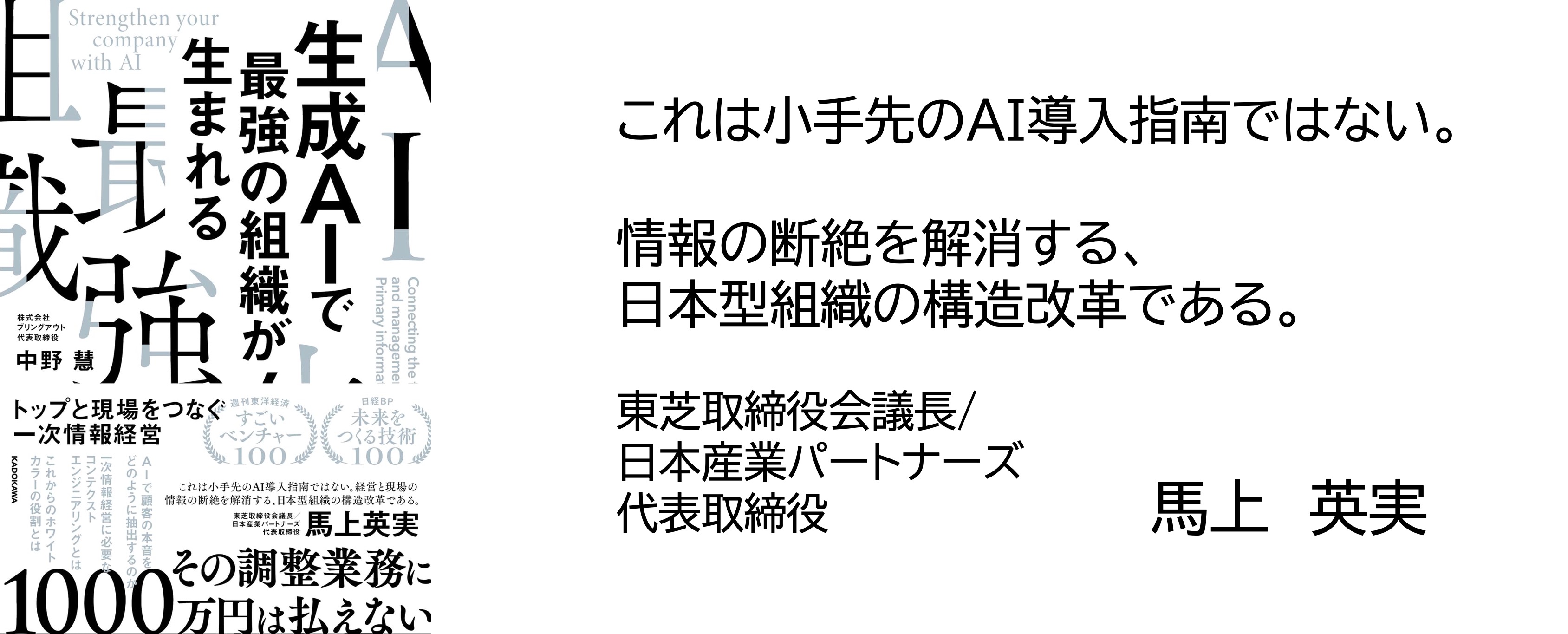 東芝取締役会議長・馬上英実氏ら経営者5名が推薦--「一次情報経営」を体系化したブリングアウト代表中野の初著、『生成AIで最強の組織が生まれる』4月20日刊行、Amazonにて予約開始 -