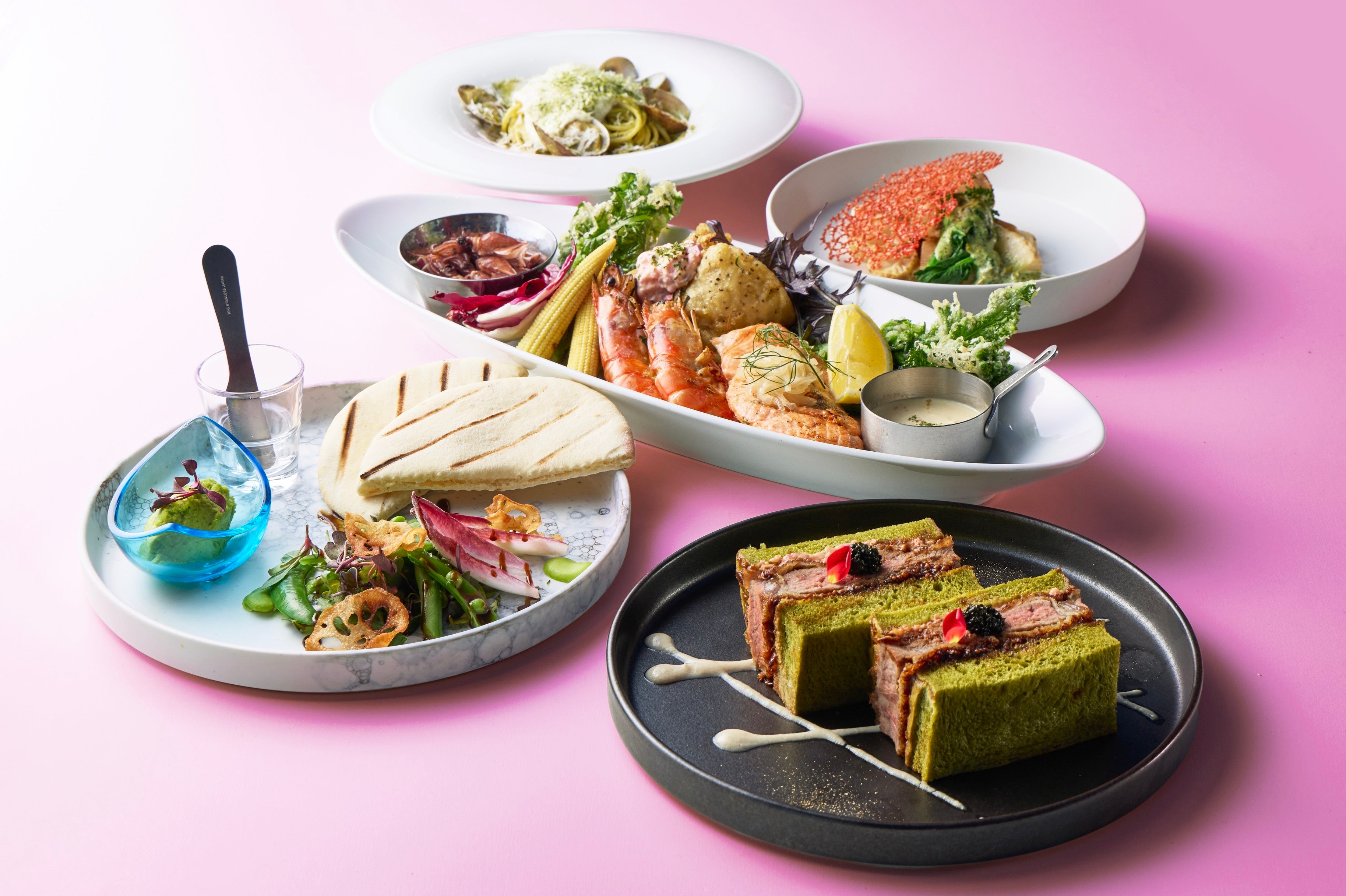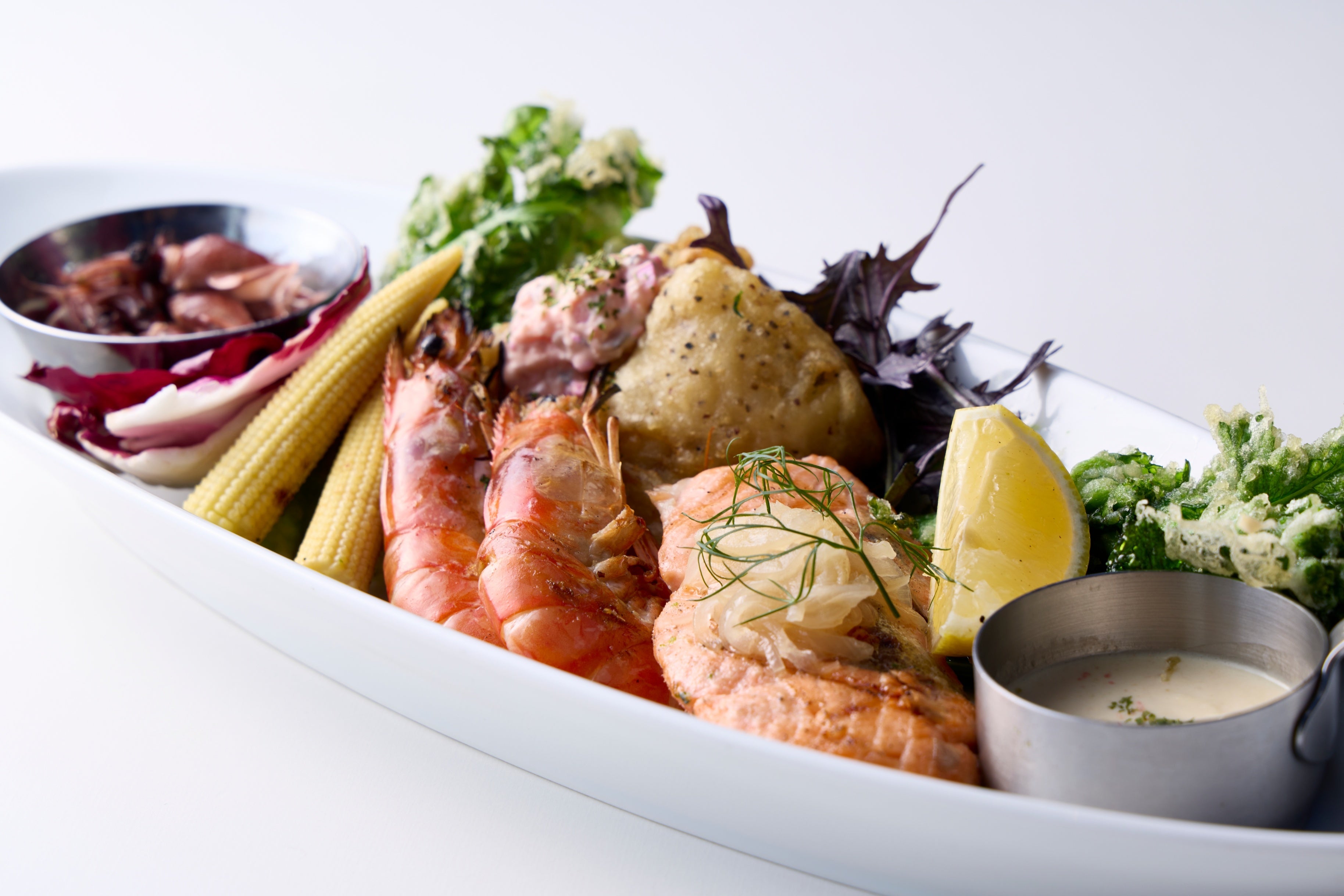 海老のグリル、サーモンのグリル、白身魚のフリット、春が旬のホタルイカと、海の幸を盛り合わせた、パーティにもピッタリの華やかなプラッター。グリルにはレモンや桜白味噌のヴァンブランソース、フリットには柴漬けのタルタルソースを合わせると魚介の旨みも膨らみます。