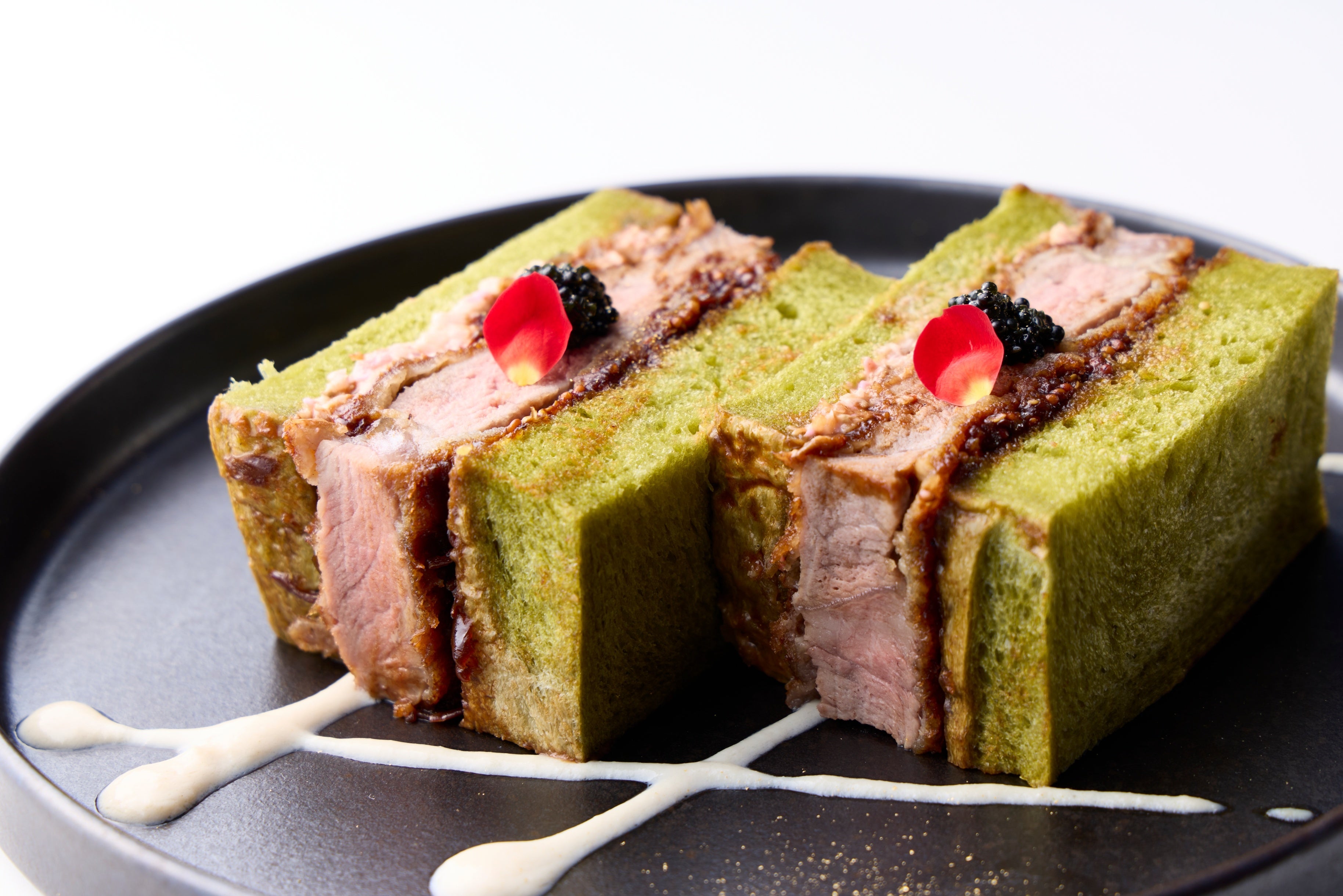 日本三大和牛の一つで、滋賀の豊かな自然環境で育てられるブランド牛「近江牛」。この近江牛を贅沢に使って厚切り&薄衣の牛カツに!抹茶特有の苦味や甘味をほのかに感じるブレッドと、肉の旨みを引き立てるソースが三位一体となった豪華なカツサンドです。
