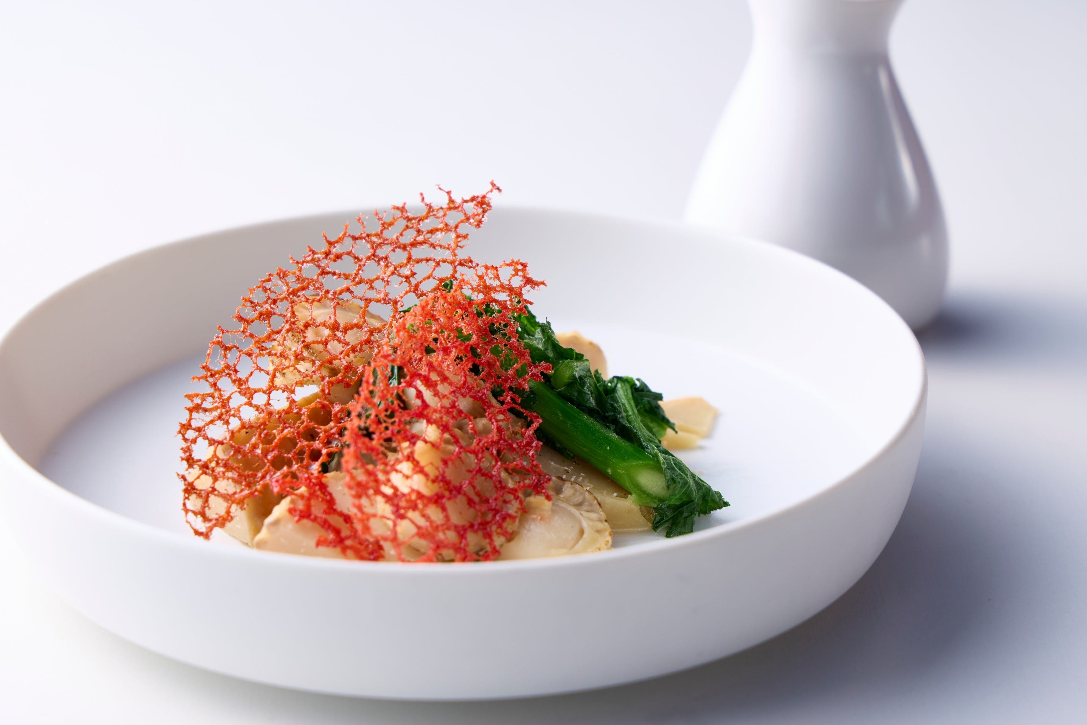 滋賀県で1200年以上もの歴史を持ち、日本茶のルーツの一つとも言われる「近江茶」。香り高くまろやかな味わいが特徴のこの茶葉を使ってジェノヴァソースに仕立てました。表面を焼き上げて蒸し煮にした旬の筍と貝柱が持つ、素材本来の味を引き立てます。