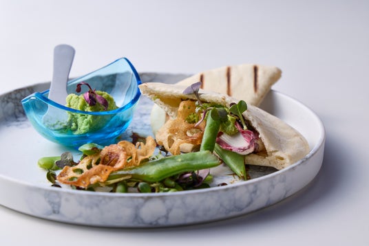 瑞々しい緑色がいかにも春らしいそら豆と練り胡麻を合わせたペーストで、新鮮な葉野菜やパリパリに揚げたレンコンなどを召し上がっていただく新感覚のサラダ。バルサミコクリームの酸味がアクセント。ピタパンで挟めばお野菜たっぷりの主食にもなる一品です。