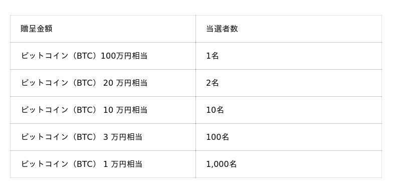 対象となる株主の皆様の中から、抽選により以下のとおり総額1,540万円相当のビットコイン(BTC)を贈呈いたします。