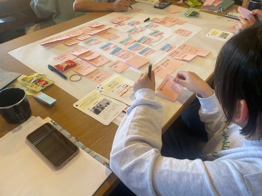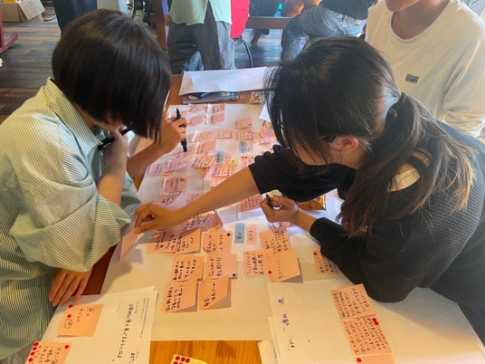 夕方|未来アイデアワークフィールドワークで感じたことをもとに、「サンゴ礁を守るために何ができるか?」というテーマでアイデアを考えます。事例カードなどを使いながら、チームでサンゴを守るための企画を考えます。