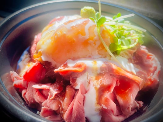 低温調理で柔らかく仕上げたローストビーフに温泉卵が絡む贅沢なローストビーフ丼が楽しめます。自家製グレイビーと爽やかなサワークリームオニオンが旨みを引き立てます。