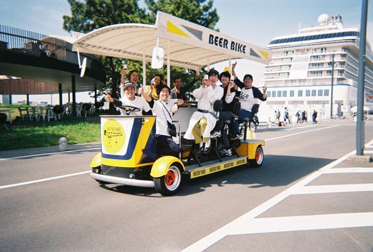 複数人でペダルを漕ぐ移動式ビアカウンターで、生演奏を聴きながらビールで乾杯!