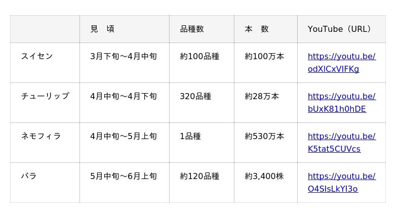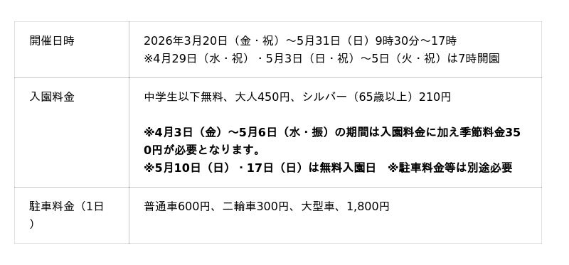 期間中は、花の観賞とあわせて楽しめるイベントや春限定グルメ・お土産品など、盛りだくさんの内容となっています。本格的な春の行楽シーズンに、季節の移ろいを感じながら、友達や家族と一緒に思い出に残るひと時をお過ごしください。