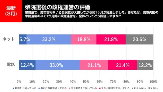 「衆院選で、高市首相率いる自民党が大勝してから約1ヶ月が経過しました。あなたは、高市内閣の衆院選後およそ1か月間の政権運営を、全体としてどう評価しますか?」と聞いた結果が上の図です。