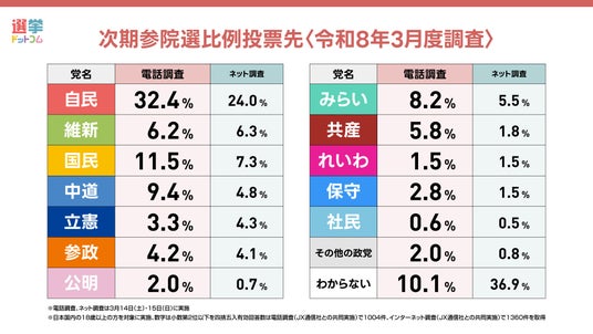 2026年3月調査の次期参院選比例投票先について