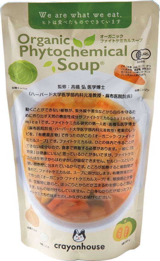 クレヨンハウスは、2020年3月5日発行のオーガニックマガジン『いいね㊽』で、抗がん剤の研究とファイトケミカルの研究者・故前田浩さん(医学博士)と高橋弘さん(医学博士)を取材し、ファイトケミカルスープの素晴らしさに出会います。その後、有機のニンニク、ニンジン、キャベツ、カボチャ、タマネギと浄水のみを使用した 「オーガニックファイトケミカルスープ Organic Phitochemical Soup(R)」 として商品化(2024年10月)。
