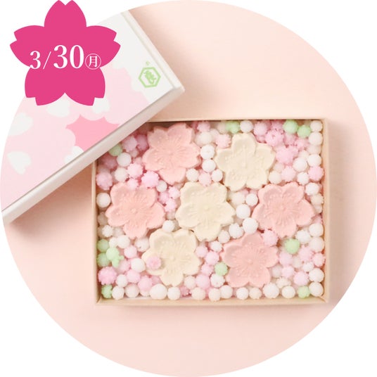 メッセージカードを添えた小箱に、桜の花の口どけのよいお⼲菓子を。
