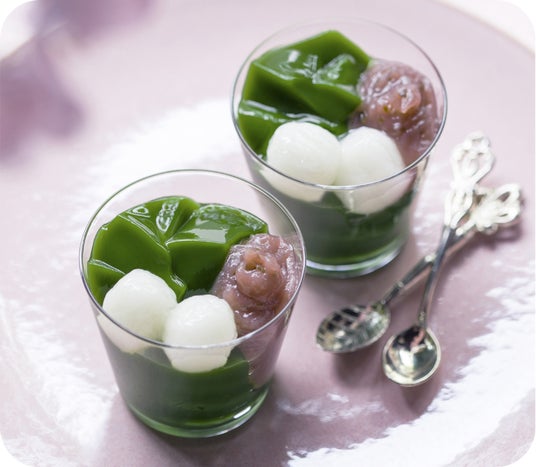 濃厚な抹茶ゼリイに、桜葉の塩漬け入り餡を合わせ、目にも鮮やか。