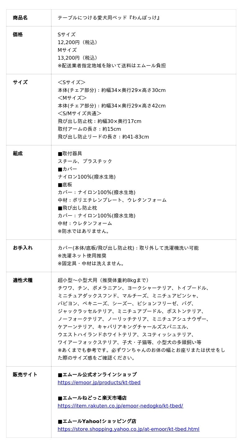 健康家具のD2C×EC事業を展開する株式会社エムール(東京都立川市:代表取締役 高橋 幸司)が運営する、愛犬愛猫専用寝具ブランド『エムールねどっこ』は、2026年3月16日より、テーブルにつける愛犬用ベッド『わんぽっけ』Sサイズの予約販売(2026年4月入荷予定)を開始しました。