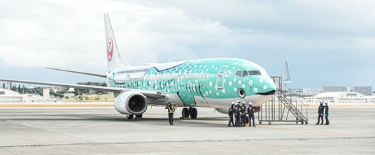 沖縄美ら海水族館とのコラボレーションにより誕生し、沖縄の空のアイコンとして親しまれている「ジンベエジェット」。沖縄の海を象徴するジンベエザメに森の緑と海の緑を掛け合わせ、搭乗されるお客様や空を見上げるすべての方々に「ワクワク」と「沖縄の自然の豊かさと大切さ」を届けるクリエイティブを実現しました。機体搭乗時にはヤンバルクイナの子供がお出迎えしていますので、ぜひご覧ください。