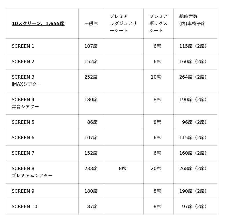 左右の壁いっぱいに拡大された巨大スクリーン(プレミアムラージフォーマット)、シアター形状に最適化した形でスピーカーをカスタマイズした良質な音響(プレミアムサウンド)、プライベート空間が確保された広々とした座席(プレミアムシート)を兼ね備えたTOHOシネマズ独自規格の高品質シアターです。