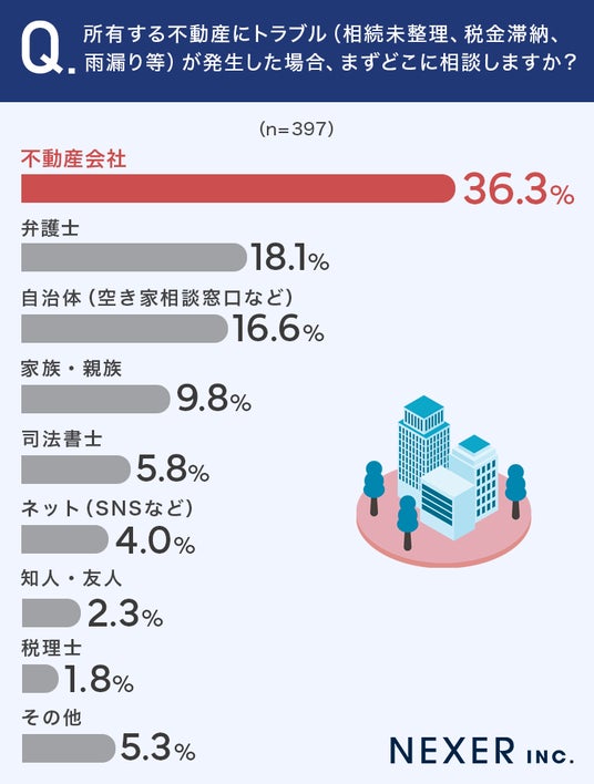 質問4:所有する不動産にトラブル(相続未整理、税金滞納、雨漏り等)が発生した場合、まずどこに相談しますか?