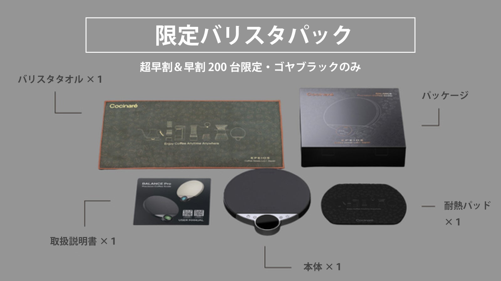 バリスタパックには一般販売用となる通常パッケージの内容物に加え、ハンドドリップする際にクロスとしても使える「バリスタタオル」や計量皿に載せて使うことで汚れ防止などにも便利な「耐熱マット」を付属。本体カラーは「ゴヤブラック」のみで限定数200台のご用意となります。